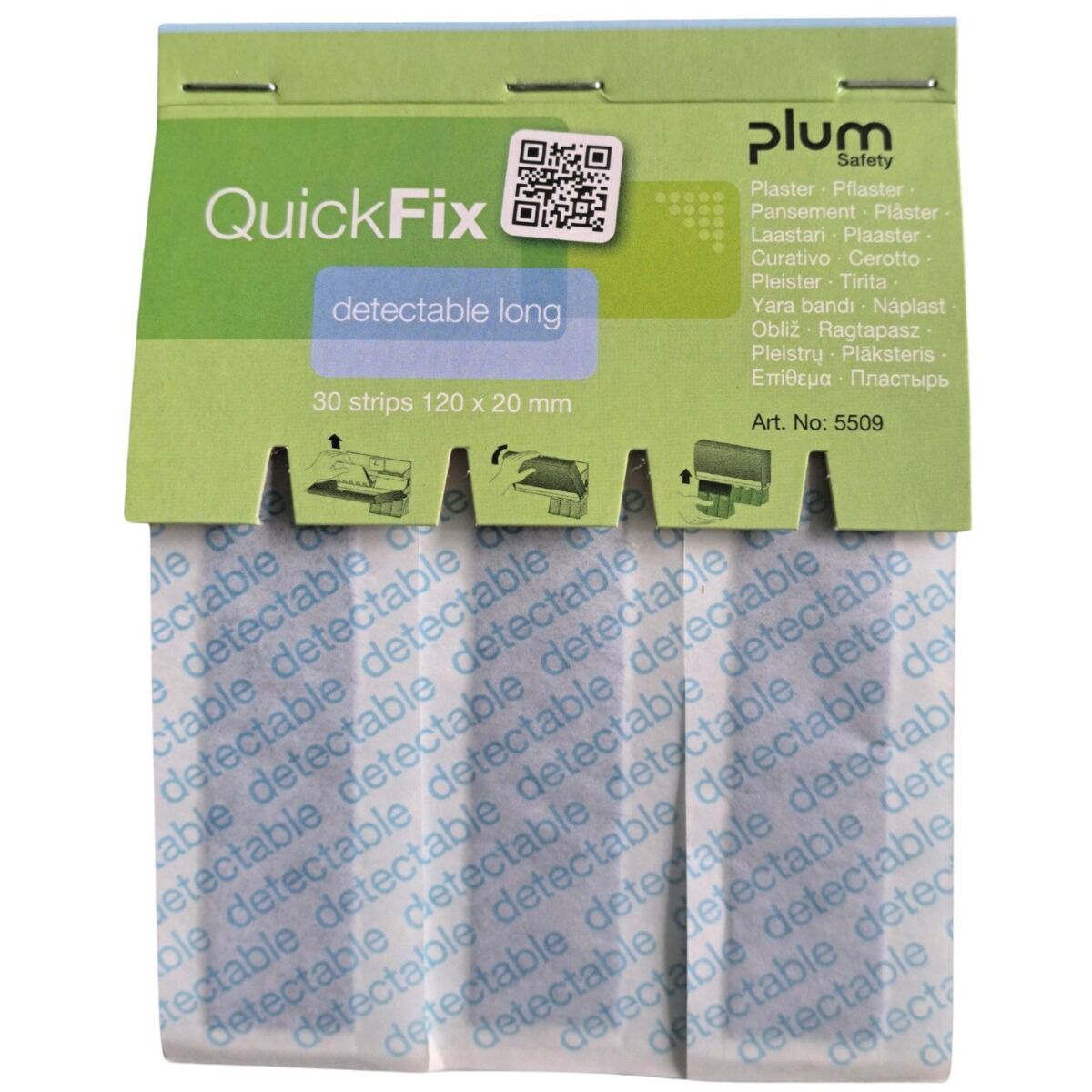 Zestaw plastrów wykrywalnych QUICKFIX (nr 5513) stanowiący wkład uzupełniający do dozownika QUICKFIX. Przeznaczone do stosowania w przemyśle spożywczym. Plastry są długie, dzięki czemu można owijać je kilkukrotnie wokół palca i mocniej przymocować.