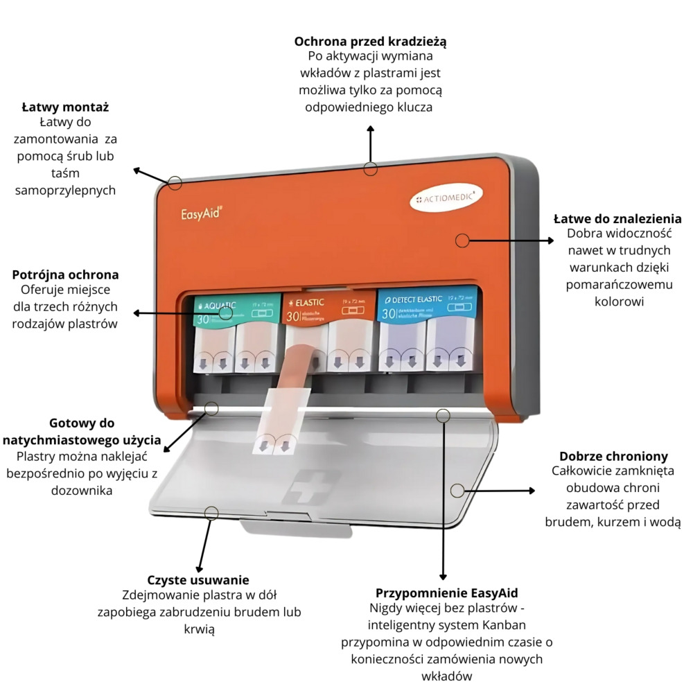 Dozownik wyposażono w system EasyAid – przypomnienie w stylu Kanban, który automatycznie informuje o konieczności uzupełnienia zapasów. Dzięki temu personel nie musi sprawdzać stanu plastrów ręcznie, co minimalizuje ryzyko braków i zapewnia ciągłą gotowość do działania.