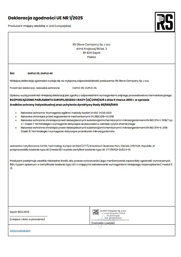 Rękawice ochronne RS DUPLO wykonane z polichlorku winylu (PVC). Szorstkowana powierzchnia oraz najwyższa odporność na ścieranie. Dedykowane do pracy w kontakcie z zagrożeniami mikrobiologicznymi oraz chemicznymi.