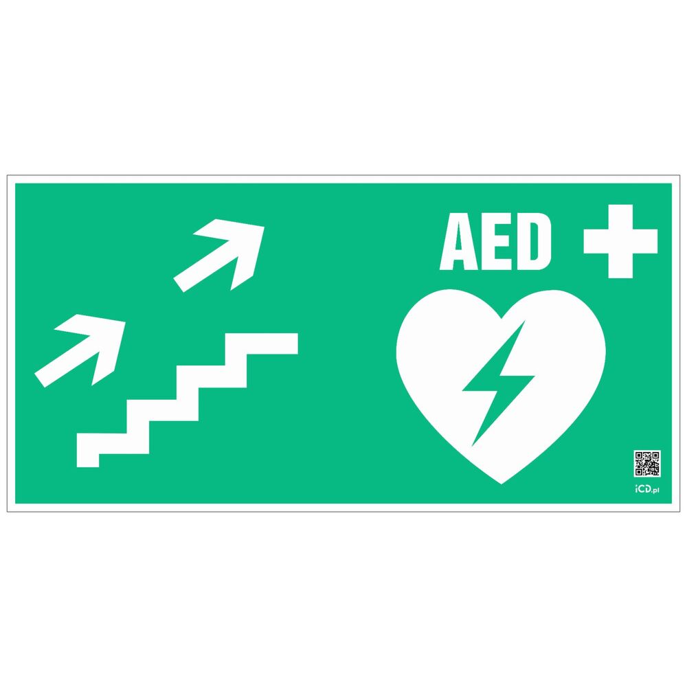 Znak informacyjny "Defibrylator AED schodami w górę w prawo" 400x200 mm, spieniona płyta 3 mm, fotolum.